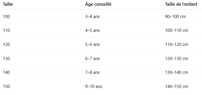 Si votre enfant est entre deux tailles, choisissez la taille supérieure pour plus de liberté de mouvement.