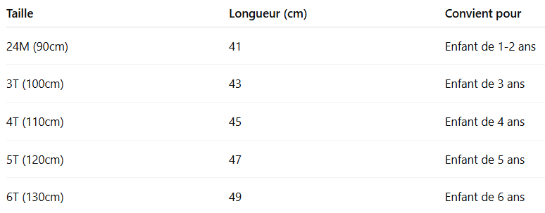 Si votre enfant est entre deux tailles ou a une carrure plus forte, prenez une taille au-dessus pour plus de confort.