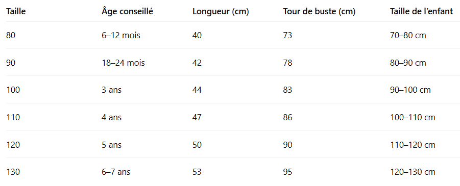 Si votre enfant est entre deux tailles, optez pour la taille supérieure pour plus de confort.