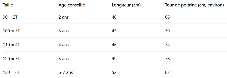 Si votre enfant est entre deux tailles, choisissez la taille au-dessus.