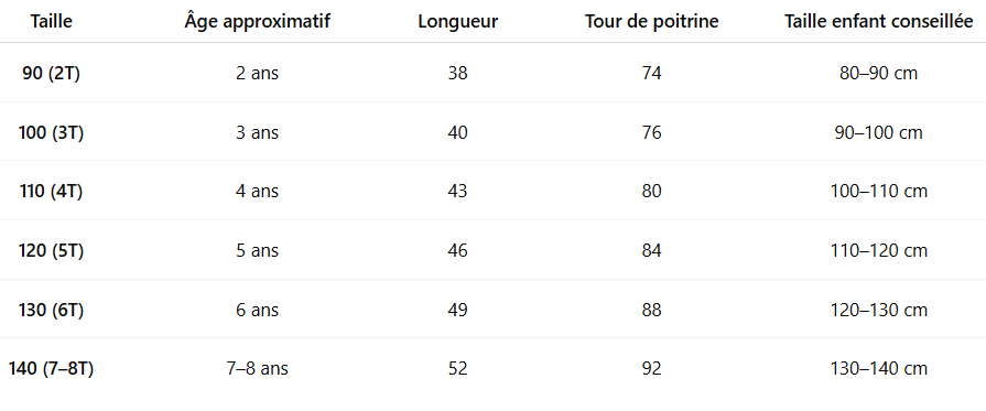 Si votre enfant est entre deux tailles ou a une carrure plus forte, prenez une taille au-dessus pour plus de confort.