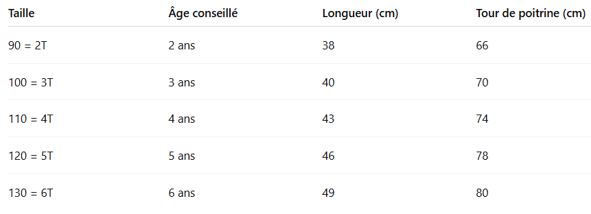 Si votre enfant est entre deux tailles, choisissez la taille au-dessus.