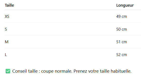 Conseil taille: les coupes étant ajustées, choisissez une à deux tailles supplémentaires après vérification du guide des tailles.