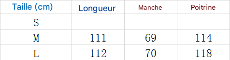 1. Veuillez vérifier attentivement le tableau des tailles avant d'acheter l'article. Si vous ne savez pas comment choisir votre taille, veuillez contacter notre service client.