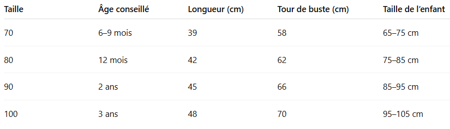Si votre enfant est entre deux tailles, choisissez la plus grande pour plus de confort.