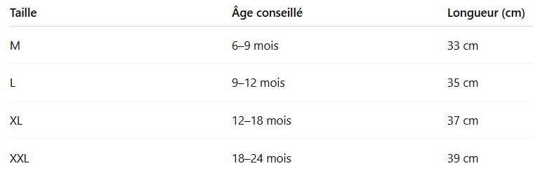 Si votre bébé est entre deux tailles, choisissez la taille supérieure.